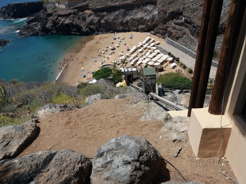 El Abama Resort es sin duda el más exclusivo del sur de la isla. En un entorno exuberante lleno de plantas tropicales que incluye piscinas, canchas de tenis, pádel y golf y espacios para la actividad de los huéspedes, se llega a una playa de arena blanca enclavada entre rocas.